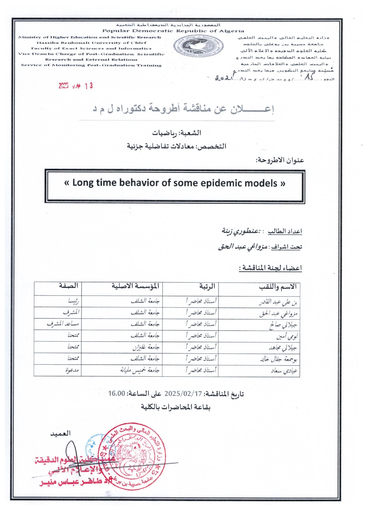 مناقشة أطروحة الدكتوراه في الرياضيات (ل.م.د) 2025/02/17