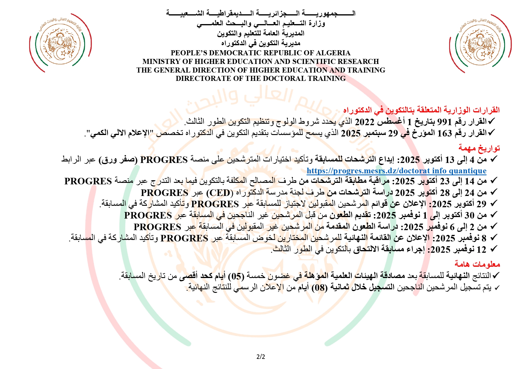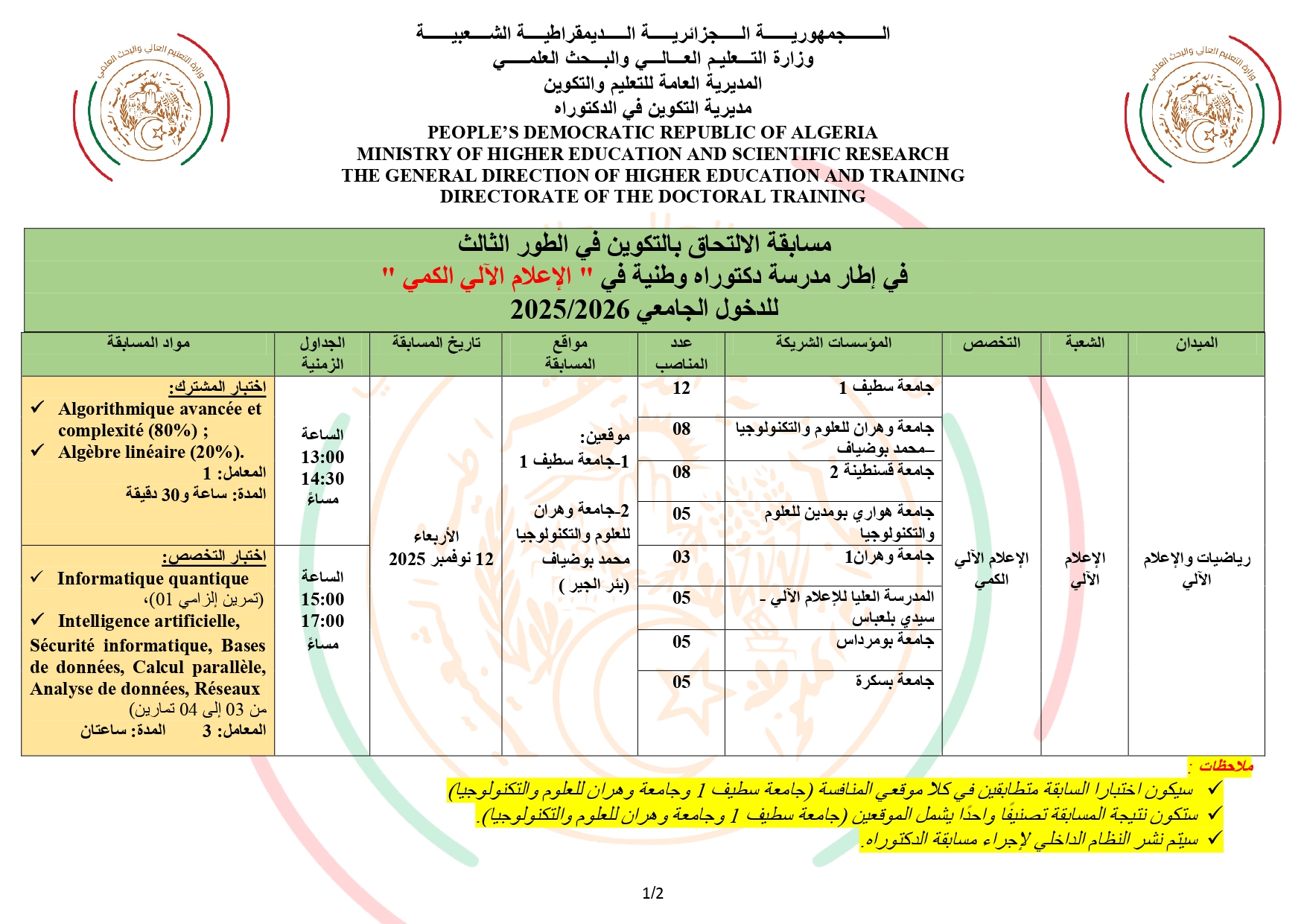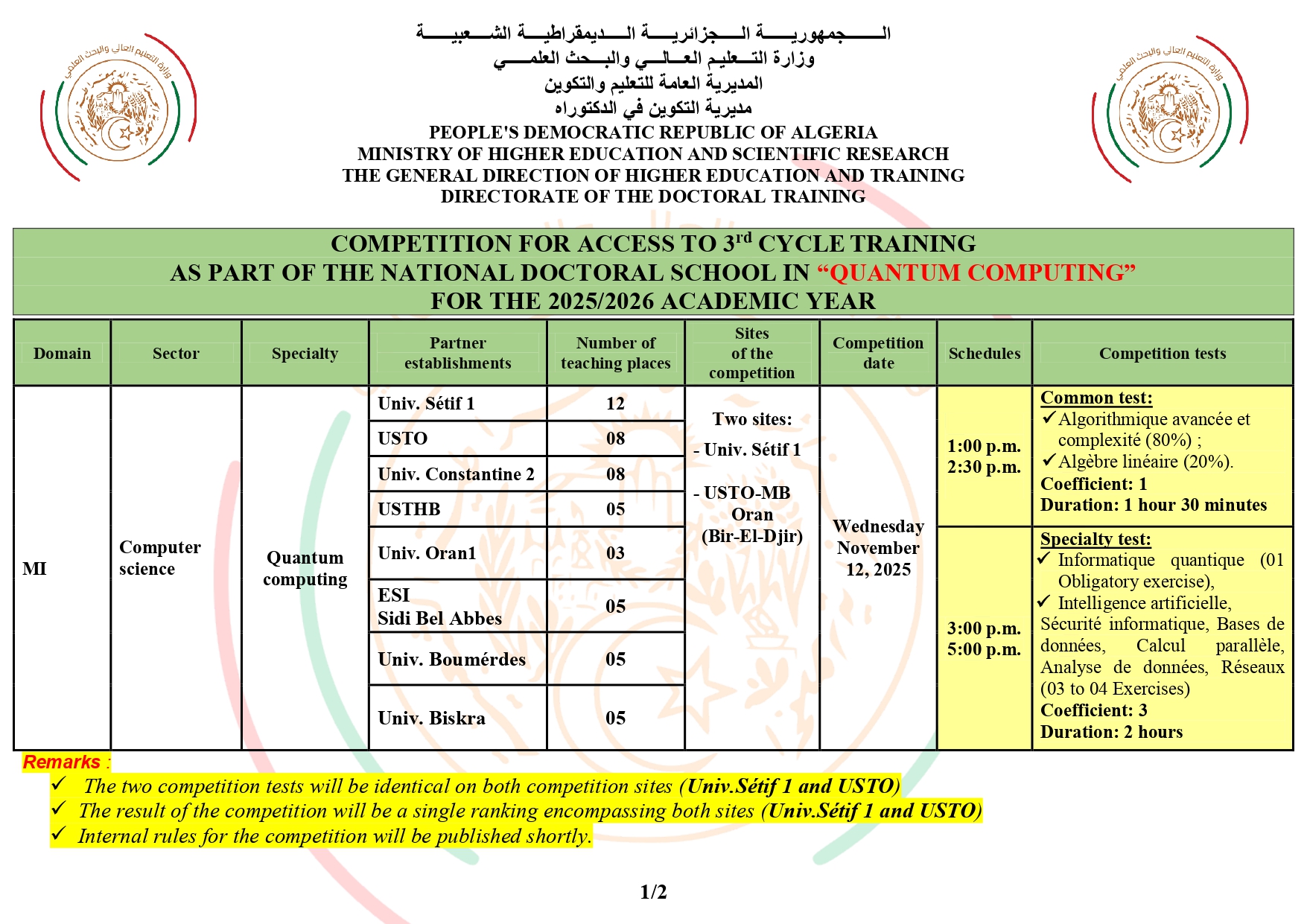 Concours D’accès A La Formation De 3ème Cycle Dans Le Cadre De L’école Doctorale Nationale En « Informatique Quantique » Au Titre De L’année Universitaire 2025/2026Par zouatenia mhamed / 23/10/2025 [divider]