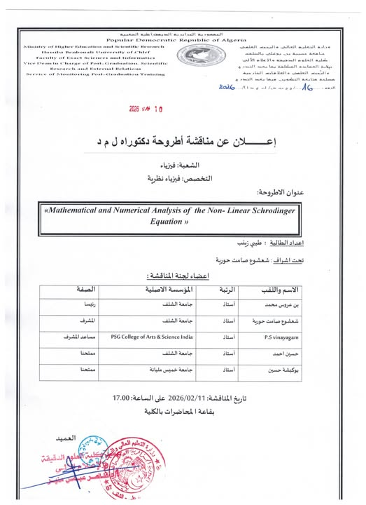 مناقشة أطروحة الدكتوراه في الرياضيات (ل.م.د) – أفريل 2026